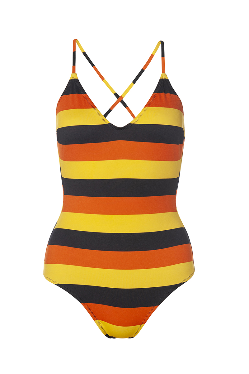 CELINE is a new design for a one-piece swimsuit. It features a fully open back with crossed adjustable straps. CELINE includes an under-band for extra support and removable pads. Fully lined and proudly made in Greece with our exclusive candy stripe printed on our earth friendly fabric.