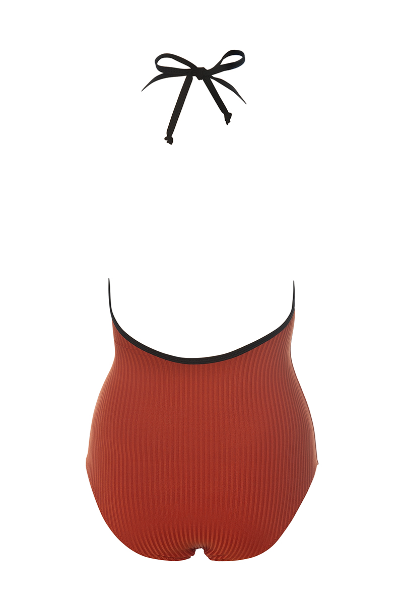 DELPHINE  is MAAN’s basic halter neck one piece swimsuit. It features an open back and a signature black strap. Fully lined and proudly  made in Greece with our TERRACOTTA stripy textured fabric.